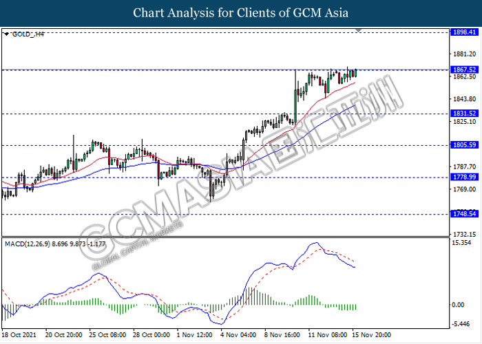 GOLD_, H4: Harga emas telah didagang dengan lebih tinggi sementara ia sedang menguji tahap rintangan 1867.50. Namun, MACD yang memaparkan isyarat momentum bearish mencadangkan komoditi ini untuk melanjutkan pengundurannya ke arah tahap sokongan 1831.50.