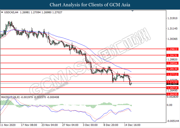 USDCAD, H4: USDCAD telah didagang dengan lebih rendah selepas ia memecah tahap sokongan sebelumnya di 1.2715. MACD yang memaparkan momentum bearish yang berterusan mencadangkan pasangan ini untuk melanjutkan kerugiannya dan menuju ke arah tahap sokongan di 1.2670.