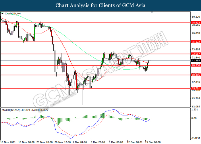 CrudeOIL, H4: Harga minyak mentah telah didagang dengan lebih tinggi selepas ia melantun dari tahap sokongan 70.35. MACD yang memaparkan momentum bullish mencadangkan komoditi ini untuk melanjutkan keuntungannya selepas ia memecah tahap rintangan tersebut.