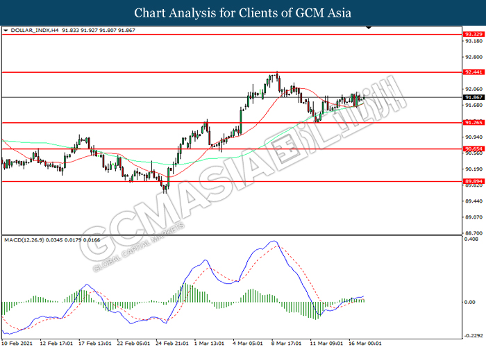 DOLLAR_INDX, H4: Indeks dolar telah didagang dengan lebih tinggi selepas ia melantun dari tahap sokongan 91.25. MACD yang memaparkan momentum bullish mencadangkan pasangan ini untuk melanjutkan keuntungannya ke arah tahap rintangan 92.45.