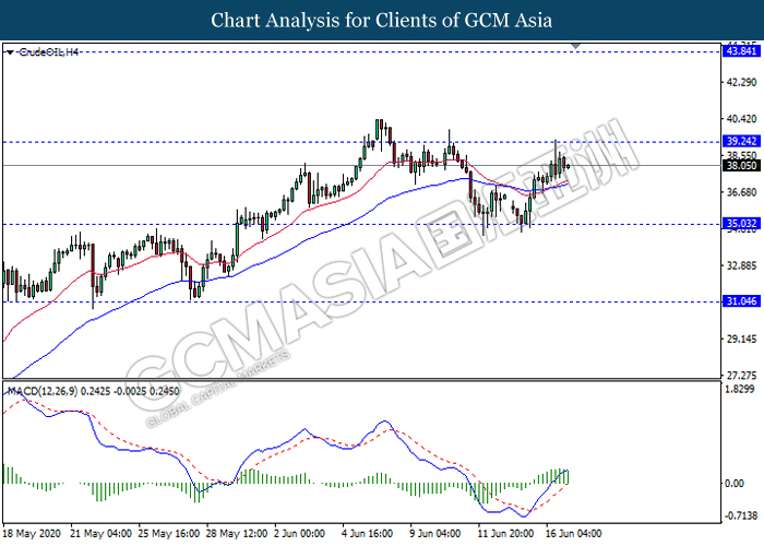 Di pasaran komoditi, harga minyak mentah telah melambung sebanyak 0.15% kepada $ 37.99 setong susulan dengan harapan dalam permintaan. Walaupun dengan peningkatan stok yang dilaporkan oleh API, sentimen keseluruhan tetap positif setelah International Energy Agency meramalkan permintaan minyak global akan mencecah 91.7 juta tong sehari pada tahun 2020, lebih tinggi daripada ramalan sebelumnya untuk bulan Mei. Sebaliknya, harga emas kekal stabil dan menokok sebanyak 0.05% kepada $ 1727.32 pada masa penulisan berikutan dengan peningkatan dalam sentimen penghindaran risiko disebabkan oleh ketakutan terhadap koronavirus gelombang kedua.