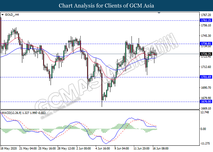 GOLD_, H4: Harga emas telah didagang dengan lebih tinggi susulan dengan lantunan dari paras rendahnya. MACD yang memaparkan isyarat momentum bearish yang berkurangan mencadangkan komoditi ini untuk melanjutkan lantunannya dalam jangka pendek ke arah tahap rintangan 1736.80.