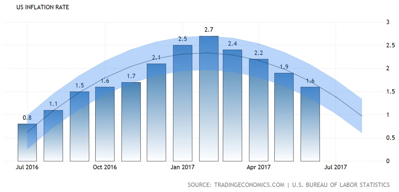 Kadar inflasi A.S. bagi perbandingan tahun-ke-tahun telah memberi bacaan 1.6% bagi bulan Jun, tersasar daripada jangkaan ekonomis dengan 1.7%.