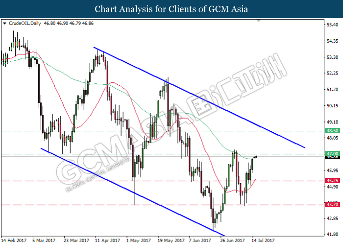 CrudeOIL, Daily: Harga minyak mentah didagang dengan lebih tinggi selepas ia melantun dari tahap sokongan 45.25. Penutupan niaga di atas tahap rintangan yang kukuh berhampiran 47.00 akan mencadangkan harga minyak untuk melanjutkan kenaikannya ke paras atas saluran menurun selepas itu.