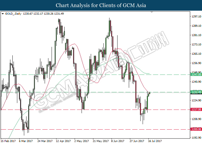 GOLD_, Daily: Harga emas meneruskan kenaikannya selepas ia melantun dari tahap sokongan berhampiran 1217.00. Penutupan niaga di atas garisan 20-MA (merah) baru-baru ini mencadangkan harga emas untuk melanjutkan kenaikannya selepas ia memecahkan tahap rintangan di 1232.00.