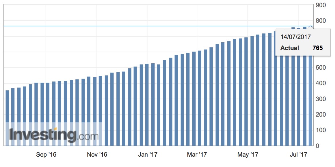 Bilangan pelantar minyak yang aktif di A.S. telah meningkat sebanyak 2 dan jumlah keseluruhan kini di paras 765.