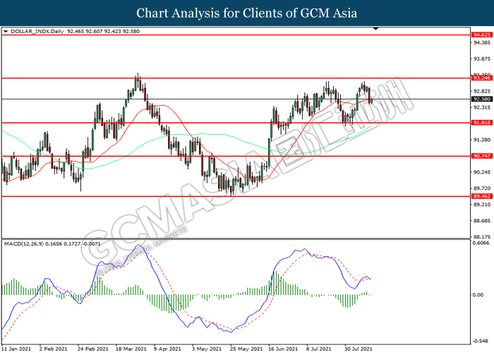 DOLLAR_INDX, Daily: Indeks Dolar telah didagang dengan lebih rendah selepas ia berundur dari tahap rintangan 93.25. MACD yang memaparkan momentum bearish mencadangkan indeks tersebut untuk melanjutkan kerugiannya ke arah tahap sokongan 91.80.