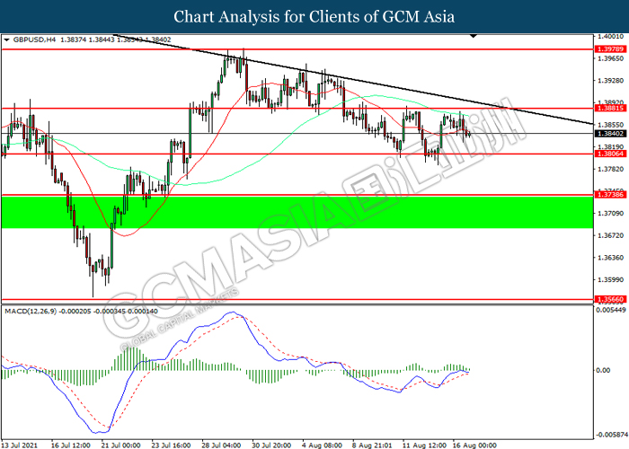 GBPUSD, H4: GBPUSD telah didagang dengan lebih rendah selepas ia berundur dari tahap rintangan 1.3880. MACD yang memaparkan momentum bullish yang berkurangan mencadangkan pasangan ini untuk melanjutkan kerugiannya ke arah tahap sokongan 1.3805.