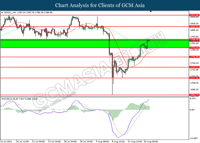 GOLD_, H4: Harga emas telah didagang dengan lebih tinggi sementara kini menguji di tahap rintangan 1788.50. Namun, MACD yang memaparkan momentum bullish yang berkurangan mencadangkan komoditi ini untuk mengalami pembetulan teknikal bagi jangka pendek.