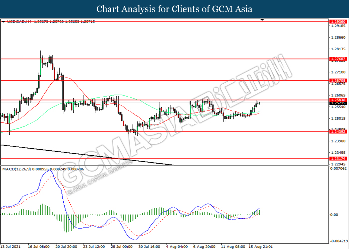 USDCAD, H4: USDCAD telah didagang dengan lebih tinggi sementara kini menguji di tahap rintangan 1.2585. MACD yang memaparkan momentum bullish mencadangkan pasangan ini untuk melanjutkan keuntungannya selepas ia memecah tahap rintangan tersebut.