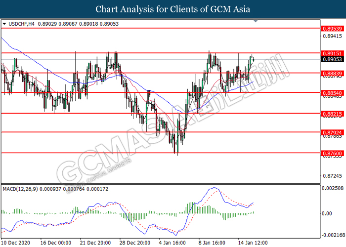 USDCHF, H4: USDCHF telah didagang dengan lebih rendah selepas ia berundur dari tahap rintangan di 0.8915. Namun, MACD yang memaparkan momentum bullish yang berterusan mencadangkan pasangan ini untuk mengalami pembetulan teknikal dan menuju ke tahap yang lebih tinggi.