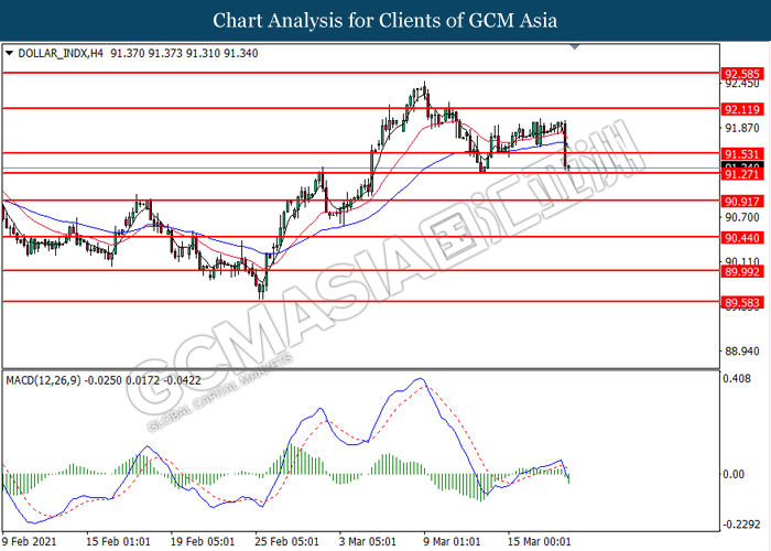 Indeks dolar yang mengukur nilainya terhadap sekumpulan enam mata wang utama gagal untuk melanjutkan kenaikannya sambil dijual dengan ketara oleh para pelabur selepas Federal Reserve mengulangi bahawa tidak akan ada kenaikan kadar faedah dalam dua tahun yang akan datang. Selepas mesyuarat yang selama dua hari itu, Federal Reserve memutuskan untuk mengekalkan kadar faedahnya tidak berubah berdekatan paras sifar sambil mengekalkan program pembelian asetnya sebanyak $120 bilion bon sebulan. Selain itu, Federal Reserve juga memberikan ramalan bahawa lonjakan yang signifikan untuk pertumbuhan ekonomi dan inflasi kerana krisis Covid-19 mereda, di mana juga meramalkan ekonomi AS berkembang pada kadar 6.5% tahun ini dan kadar pengangguran jatuh dari anggaran sebelumnya 5.0% ke 4.5% sebelum tahun 2021 berakhir. Selain itu, bank pusat AS juga menjangka inflasi meningkat pada kadar 2.4% pada tahun ini, jauh melebihi ramalan sebelumnya pada 1.8%. Pemulihan ekonomi AS semasa telah mengubah pandangan bank pusat AS mengenai prospek ekonomi masa depan, menjadi lebih optimis disebabkan oleh kemajuan program vaksinasi dan pelaksaan pelan rangsangan baru-baru ini yang bernilai $1.9 trilion. Walaupun demikian, Federal Reserve menegaskan peserta pasaran dengan menyatakan bahawa mereka tidak akan menaikan kadar faedah sehingga tahun 2023 meskipun prospeknya bertambah baik. Semasa penulisan, indeks dolar turun sebanyak 0.53% ke $91.38.