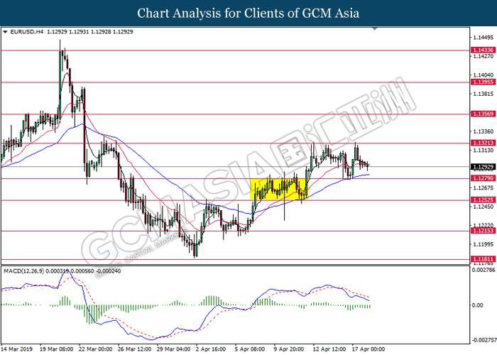 EURUSD, H4: EURUSD telah didagang dengan lebih rendah selepas ia berundur dari tahap rintangan di 1.1320. MACD yang memaparkan momentum bearish mencadangkan pasangan ini untuk meneruskan aliran bearish dan menuju ke arah 1.1280.