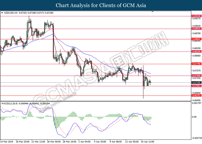 NZDUSD, H4: NZDUSD telah didagang dengan lebih tinggi selepas ia melantun dari tahap sokongan 0.6705. MACD yang memaparkan penyusutan pada momentum bearish mencadangkan pasangan ini untuk melanjutkan lantunannya dan menuju ke arah 0.6740.