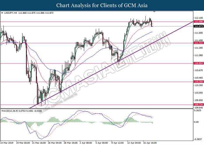 USDJPY, H4: USDJPY telah didagang dengan lebih rendah selepas ia berundur dari tahap rintangan 112.00. MACD yang memaparkan momentum bearish mencadangkan pasangan ini untuk melanjutkan kerugiannya dan menuju ke tahap sokongan di 111.40.