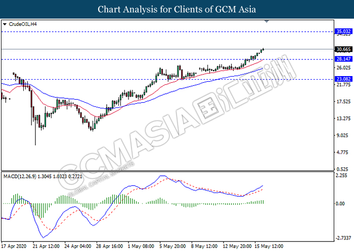 Di pasaran komoditi, harga minyak mentah telah melonjak sebanyak 3,74% kepada $ 30,66 setong susulan dengan isyarat dalam kenaikan permintaan petrol telah membantu komoditi tersebut untuk mendapat momentum. Menurut kepada pengesan harga bahan bakar GasBuddy, permintaan pada minggu terakhir bulan April telah meningkat semula sebanyak 22% dari minggu sebelumnya di mana permintaan petrol adalah terendah pada 5 April hingga 11 April setelah beberapa negeri membuka kembali ekonomi mereka. Sebaliknya, harga emas juga naik sebanyak 1.08% kepada $ 1761.92 se troy auns berikutan dengan peningkatan dalam ketegangan antara AS dan China.