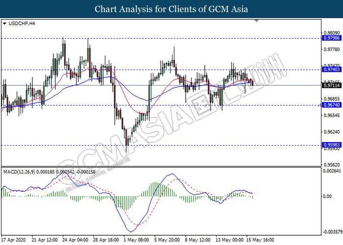 USDCHF, H4: USDCHF telah didagang dengan lebih rendah susulan dengan pengunduran dari tahap rintangan 0.9740. MACD yang memaparkan isyarat momentum bearish dengan formasi silang emas mencadangkan pasangan ini untuk melanjutkan kerugiannya ke arah tahap sokongan 0.9475.