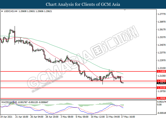 USDCAD, H4: USDCAD telah didagang dengan lebih rendah selepas ia memecahkan tahap rintangan 1.2080. MACD yang memaparkan momentum bearish mencadangkan pasangan ini untuk didagang dengan lebih rendah dan menuju ke arah 1.2010.