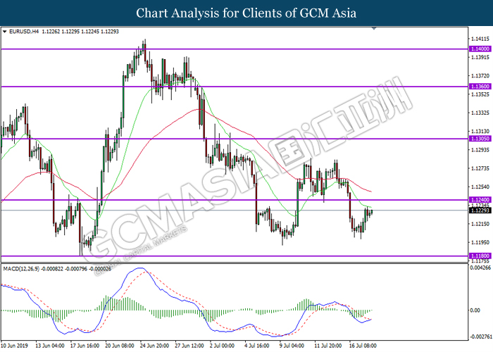 EURUSD, H4: EURUSD telah didagang dengan lebih tinggi sementara menguji berdekatan tahap rintangan 1.1240. MACD yang memaparkan isyarat bias bullish dengan permulaan formasi silang emas mencadangkan pasangan ini untuk melanjutkan keuntungannya selepas ia berjaya untuk memecahkan pada tahap rintangan tersebut.