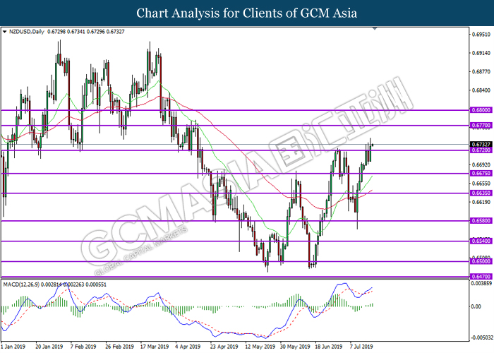 NZDUSD, Daily: NZDUSD telah didagang dengan lebih tinggi susulan dengan pemecahan dari tahap rintangan sebelumnya di 0.6720. MACD yang memaparkan momentum bullish yang berterusan mencadangkan pasangan ini untuk melanjutkan keuntungannya ke arah tahap rintangan 0.6770.