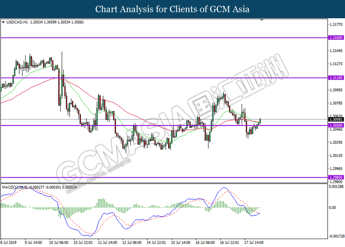 USDCAD, H1: USDCAD telah didagang dengan lebih tinggi berikutan dengan pemecahan dari tahap rintangan sebelumnya di 1.3050. MACD yang memaparkan isyarat bias bullish dengan permulaan formasi silang emas mencadangkan pasangan ini untuk melanjutkan keuntungannya ke arah tahap rintangan 1.3110.