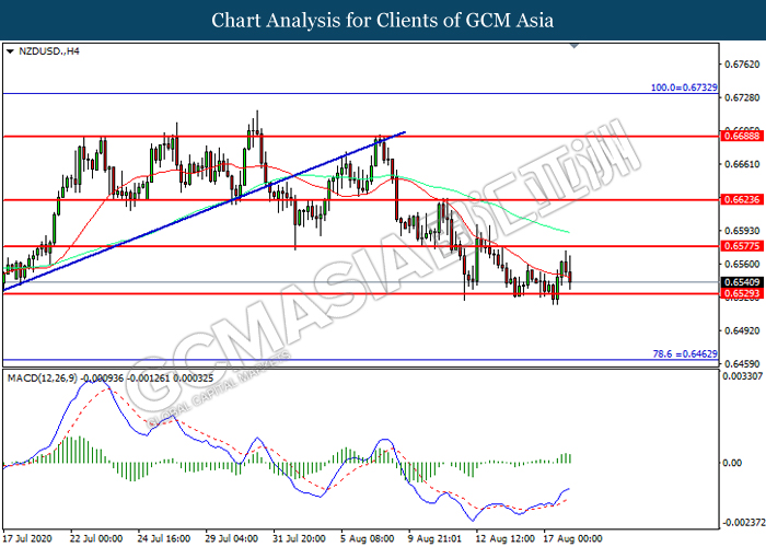 NZDUSD, H4: NZDUSD telah didagang dengan lebih rendah sementara kini berhampiran dengan tahap sokongan 0.6530. MACD yang memaparkan momentum bullish yang berkurangan mencadangkan pasangan ini untuk melanjutkan kerugiannya selepas ia memecah tahap sokongan tersebut.