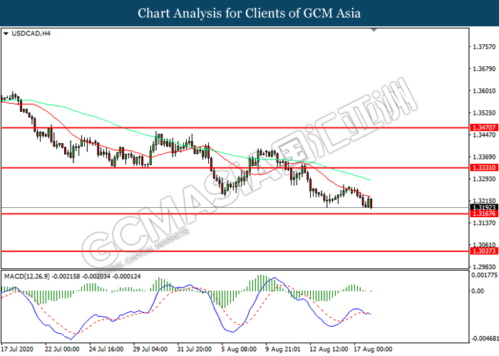 USDCAD, H4: USDCAD telah didagang dengan lebih rendah sementara kini menguji di tahap sokongan 1.3165. MACD yang memaparkan momentum bearish mencadangkan pasangan ini untuk melanjutkan kerugiannya selepas ia memecah tahap sokongan tersebut.