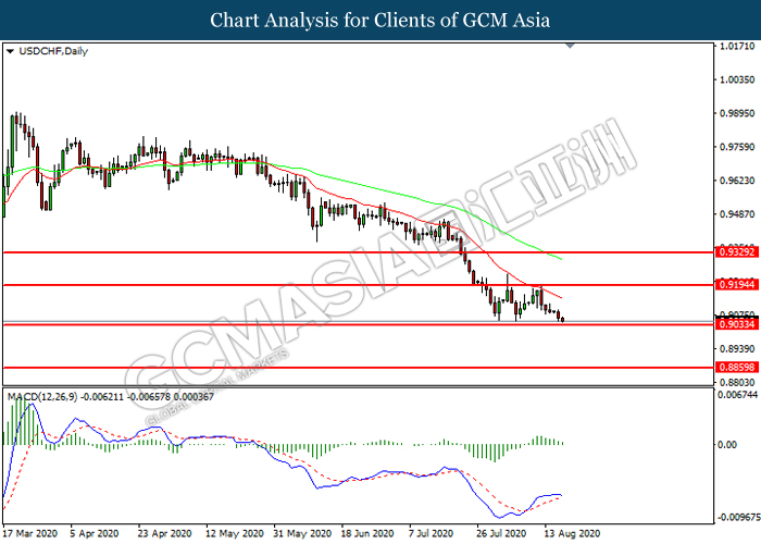 USDCHF, Daily: USDCHF telah didagang dengan lebih rendah sementara kini menguji di tahap sokongan 0.9035. MACD yang memaparkan momentum bullish yang berkurangan mencadangkan pasangan ini untuk melanjutkan kerugiannya selepas ia memecah tahap sokongan tersebut.