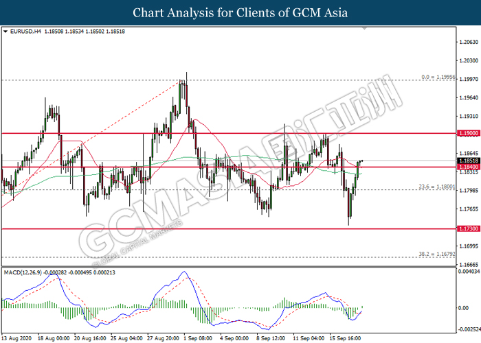 EURUSD, H4: EURUSD telah didagang dengan lebih tinggi selepas ia melantun dari paras bawahnya. MACD yang memaparkan isyarat bullish mencadangkan pasangan ini untuk meningkat bagi jangka pendek.