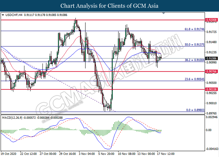 USDCHF, H4: USDCHF telah didagang dengan lebih tinggi selepas ia melantun dari tahap sokongan di 0.9100. MACD yang memaparkan isyarat momentum bearish yang berkurangan mencadangkan pasangan ini untuk menlanjutkan keuntungannya dan menuju ke arah tahap rintangan di 0.9135.