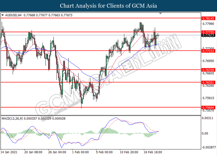 AUDUSD, H4: AUDUSD telah didagang dengan lebih tinggi sementara ia sedang menguji tahap rintangan di 0.7775. MACD yang memaparkan momentum bearish yang berkurangan mencadangkan pasangan ini untuk melanjutkan keuntungannya selepas ia memecah tahap rintangan tersebut.
