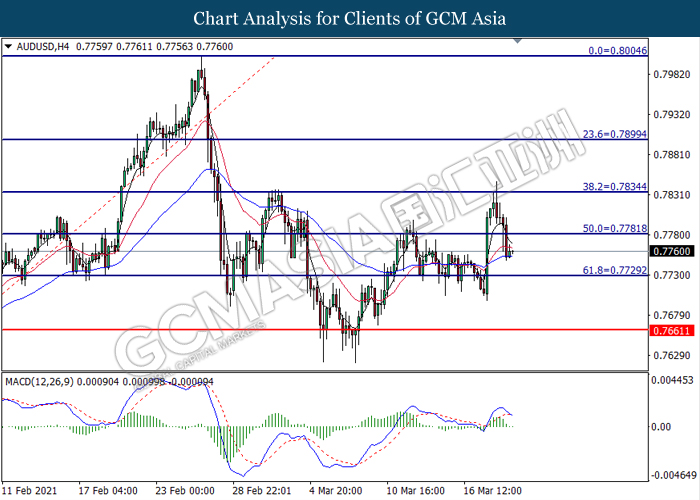 AUDUSD, H4: AUDUSD telah didagang dengan lebih rendah selepas ia memecah tahap sokongan sebelumnya di 0.7780. MACD yang memaparkan momentum bullish yang berkurangan mencadangkan pasangan ini untuk melanjutkan kerugiannya dan menuju ke arah tahap sokongan di 0.7730.