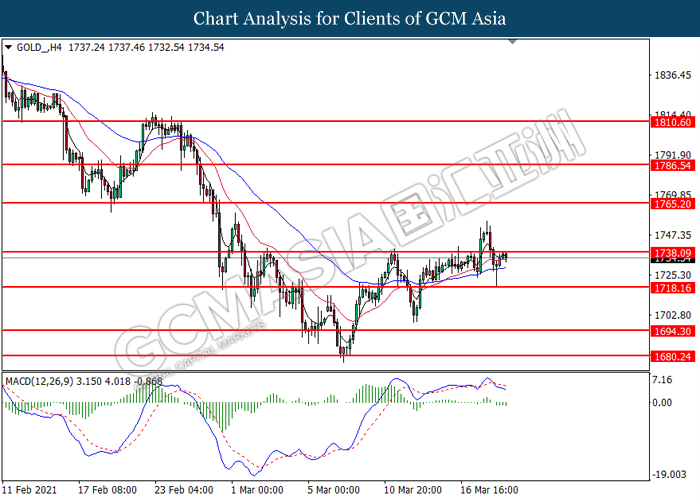 GOLD_, H4: Harga emas telah didagang dengan lebih tinggi sementara ia sedang menguji tahap rintangan di 1738.10. Namn, MACD yang memaparkan momentum bearish yang berterusan mencadangkan komoditi ini untuk mengalami pembetulan teknikal dan menuju ke arah yang lebih rendah.