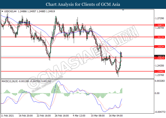 USDCAD, H4: USDCAD telah didagang dengan lebih rendah selepas ia berundur dari tahap yang lebih tinggi. Namun, MACD yang menunjukkan isyarat momentum bullish mencadangkan pasangan ini untuk didagang dengan lebih tinggi sebagai pembetulan teknikal.