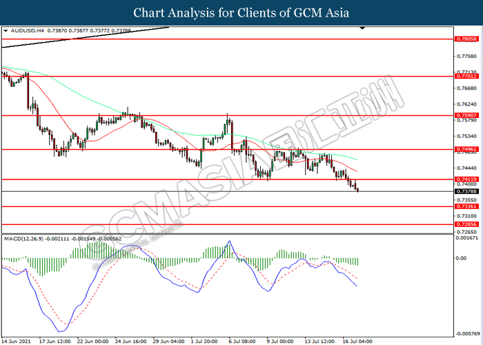 AUDUSD, H4: AUDUSD telah didagang dengan lebih rendah selepas ia memecah tahap sokongan terdahulu 0.7410. MACD yang memaparkan momentum bearish mencadangkan pasangan ini untuk melanjutkan kerugiannya ke arah tahap sokongan 0.7335.