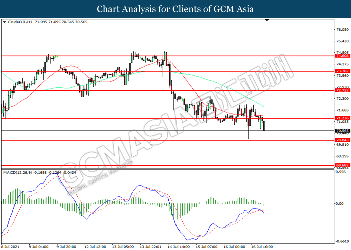 Bagi pasaran komoditi, harga minyak mentah telah menyusut sebanyak 0.57% ke $71.10 setong semasa penulisan di tengah-tengah peningkatan jumlah varian Delta di seluruh dunia telah mengurangkan daya tarikan untuk permintaan komoditi hitam ini. Sebaliknya, harga emas telah menyusut sebanyak 0.01% ke $1812.20 per troy ounces di tengah pengukuhan Dolar AS.