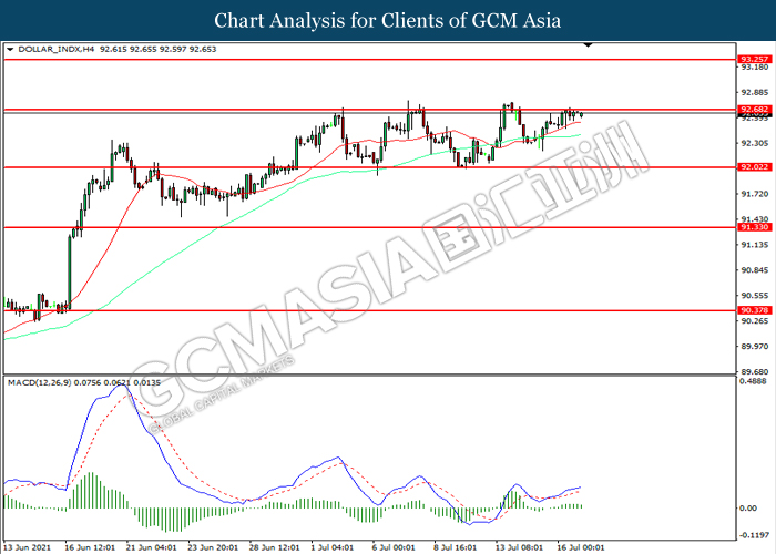 DOLLAR_INDX, H4: Indeks dolar telah didagang dengan lebih tinggi sementara kini menguji di tahap rintangan 92.70. Namun, MACD yang memaparkan momentum bullish yang berkurangan mencadangkan indeks tersebut untuk mengalami pembetulan teknikal bagi jangka pendek.