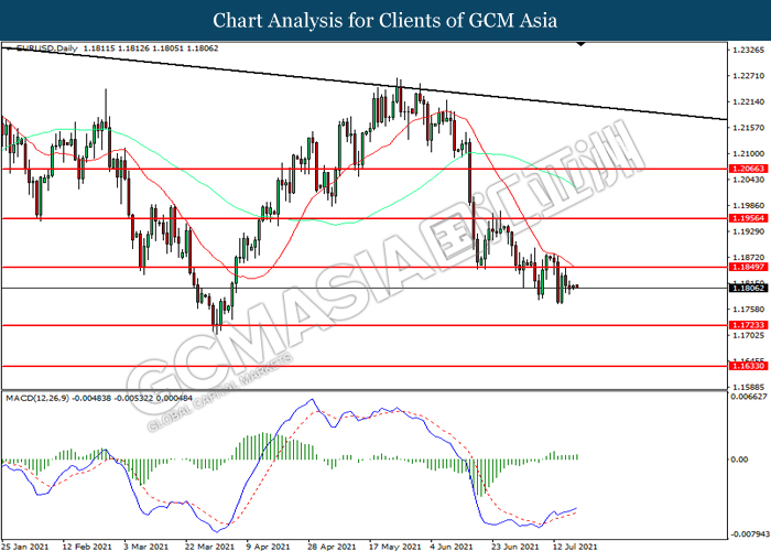 EURUSD, Daily: EURUSD telah didagang dengan lebih rendah selepas ia memecah tahap sokongan terdahulu 1.1850. Namun, MACD yang memaparkan momentum bullish mencadangkan pasangan ini untuk mengalami pembetulan teknikal bagi jangka pendek.
