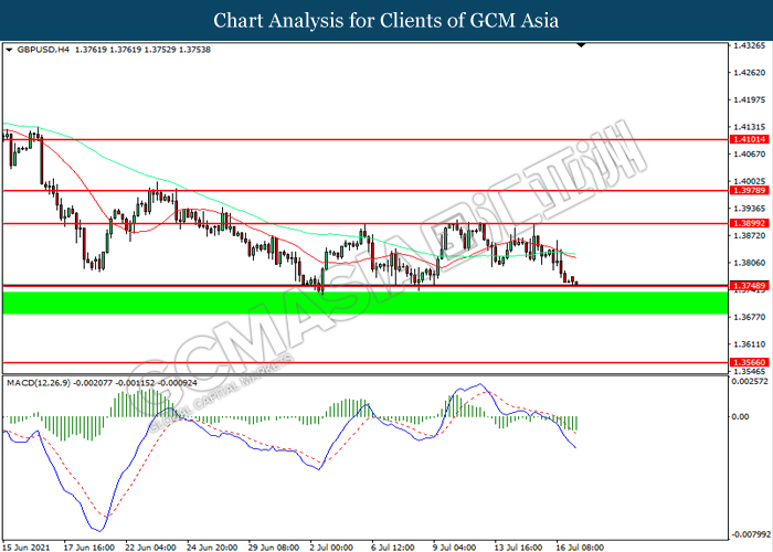 GBPUSD, H4: GBPUSD telah didagang dengan lebih rendah sementara kini menguji di tahap sokongan 1.3750. MACD yang memaparkan momentum bearish mencadangkan pasangan ini untuk melanjutkan kerugiannya selepas ia memecah tahap sokongan tersebut.