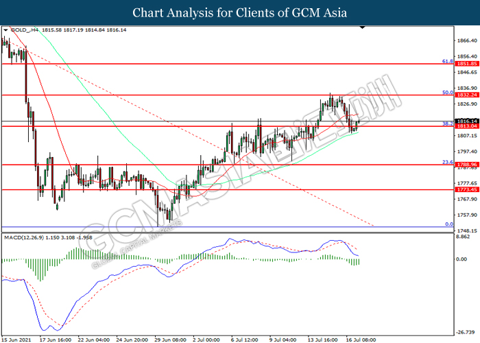 GOLD_, H4: Harga emas telah didagang dengan lebih rendah sementara kini menguji di tahap sokongan 1813.05. Namun, MACD yang memaparkan momentum bearish yang berkurangan mencadangkan komoditi ini untuk mengalami pembetulan teknikal bagi jangka pendek.