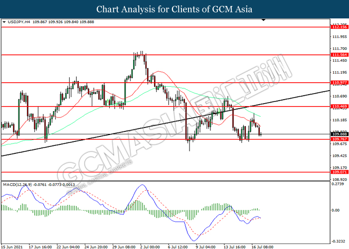 USDJPY, H4: USDJPY telah didagang dengan lebih rendah sementara kini menguji di tahap sokongan 109.75. MACD yang memaparkan momentum bullish yang berkurangan mencadangkan pasangan ini untuk melanjutkan kerugiannya selepas ia memecah tahap sokongan tersebut.