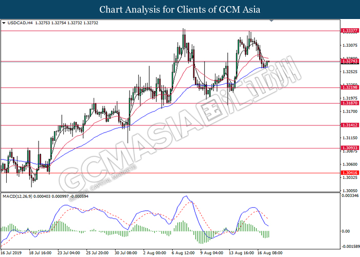 USDCAD, H4: USDCAD telah didagang dengan lebih tinggi sementara menguji pada tahap rintangan 1.3275. MACD yang memaparkan penyusutan pada momentum bearish mencadangkan pasangan ini untuk melanjutkan kenaikannya selepas ia berjaya untuk memecahkan pada tahap rintangan tersebut.