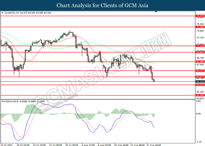 CrudeOIL, H4: Harga minyak mentah telah didagang dengan lebih rendah selepas ia memecah tahap sokongan terdahulu 65.05. MACD yang memaparkan momentum bearish mencadangkan komoditi ini untuk melanjutkan kerugiannya ke arah tahap sokongan 63.45.