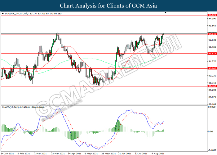 Indeks Dolar yang didagang terhadap sebakul enam pasangan mata wang utama telah menerima momentum bullish semalam ke atas latar belakang kenyataan hawkish dari Federal Reserve semalam. Menurut kepada Reuters, kebanyakan pembuat dasar Federal Reserve percaya bahawa wajar bagi Fed untuk mula mengurangkan program pembelian bon tahun ini selepas pemulihan ekonomi dengan ketara. Sebelumnya, Fed telah menetapkan sasaran untuk memulakan pengurangan pembelian bon. Sejak pertemuan bulan Julai, pasaran tenaga kerja dari Amerika Syarikat telah meningkat dengan ketara kerana ekonomi menghasilkan 943,000 pekerjaan bulan lalu. Tambahan pula, data-data ekonomi terdahulu telah menunjukkan kadar inflasi telah meningkat dengan ketara dan ia juga lebih tinggi daripada jangkaan terdahulu dari Fed. Meskipun demikian, kebangkitan semula kes-kes Covid-19 di seluruh dunia telah menimbulkan keraguan pada tahap pemulihan, mengurangkan harapan untuk mengetatkan dasar monetari. Semasa penulisan, Indeks Dolar telah meningkat sebanyak 0.21% ke 93.35.