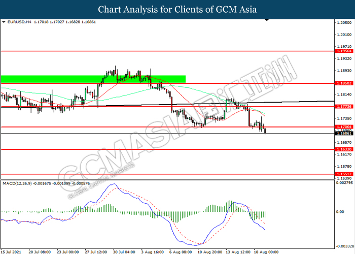 EURUSD, H4: EURUSD telah didagang dengan lebih rendah selepas ia memecah tahap sokongan terdahulu 1.1705. MACD yang memaparkan momentum bearish mencadangkan pasangan ini untuk melanjutkan kerugiannya ke arah tahap sokongan 1.1635.