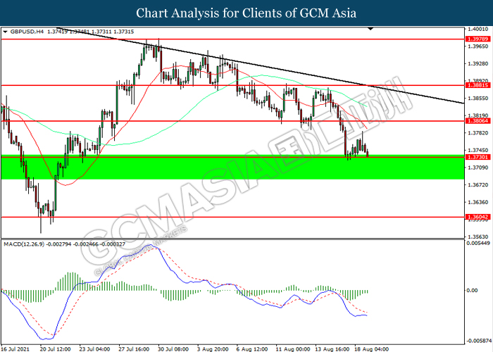 GBPUSD, H4: GBPUSD telah didagang dengan lebih rendah sementara kini menguji di tahap sokongan 1.3740. MACD yang memaparkan momentum bearish mencadangkan pasangan ini untuk melanjutkan kerugiannya selepas ia memecah tahap sokongan tersebut.
