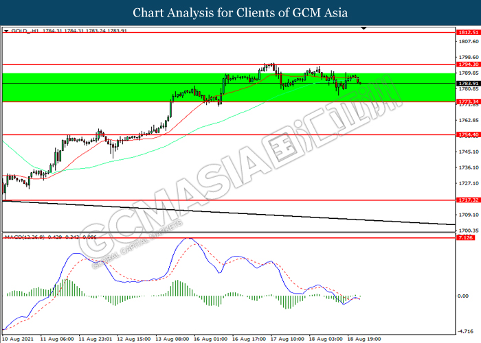GOLD_, H1: Harga emas telah didagang dengan lebih rendah selepas ia berundur dari tahap rintangan 1794.30. MACD yang memaparkan momentum bearish mencadangkan komoditi ini untuk melanjutkan kerugiannya ke arah tahap sokongan 1773.35
