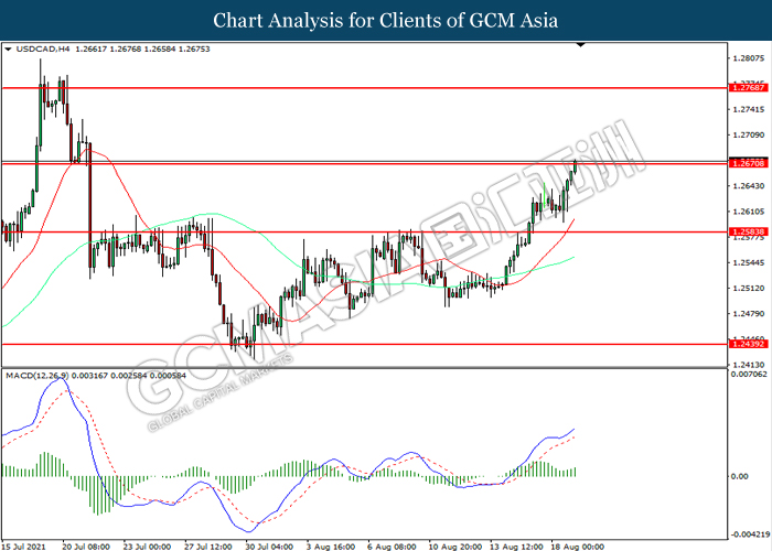 USDCAD, H4: USDCAD telah didagang dengan lebih tinggi sementara kini menguji di tahap rintangan 1.2670. MACD yang memaparkan momentum bullish mencadangkan pasangan ini untuk melanjutkan keuntungannya selepas ia memecah tahap rintangan tersebut.