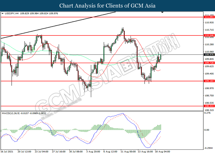 USDJPY, H4: USDJPY telah didagang dengan lebih tinggi selepas ia memecah tahap rintangan terdahulu 109.75. MACD yang memaparkan momentum bullish mencadangkan pasangan ini untuk melanjutkan keuntungannya ke arah tahap rintangan 110.55.