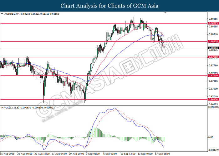AUDUSD, H4: AUDUSD telah didagang dengan lebih rendah selepas ia memecah tahap sokongan sebelumnya. MACD yang memaparkan momentum bearish mencadangkan pasangan ini untuk melanjutkan kerugiannya ke arah tahap sokongan 0.6795.